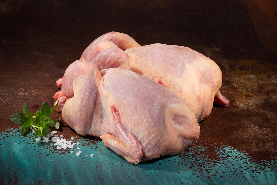 Bresse-Huhn Kapaun Stubenküken Wachteln und Tauben. Die Wachteln waschen trocken tupfen innen und außen salzen und pfeffern.